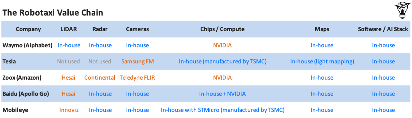 Robotaxis aren’t built by one company. They’re an ecosystem: sensors, chips, maps, safety systems, vehicles, and the ride-hailing layer. But how much of that stack each operator tries to own varies - and in this section, we’ll look at the suppliers most likely to benefit if any of the leading players successfully scales.