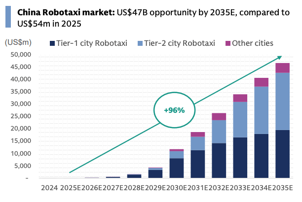 China offers a concrete view of how quickly this could build. Goldman Sachs estimates the Chinese market will expand from $54 million in 2025 to about $12 billion by 2030, supported by roughly half a million vehicles, and to $44–47 billion by 2035. Thanks to lower vehicle costs and explicit policy backing, China looks set to scale faster than any other region.